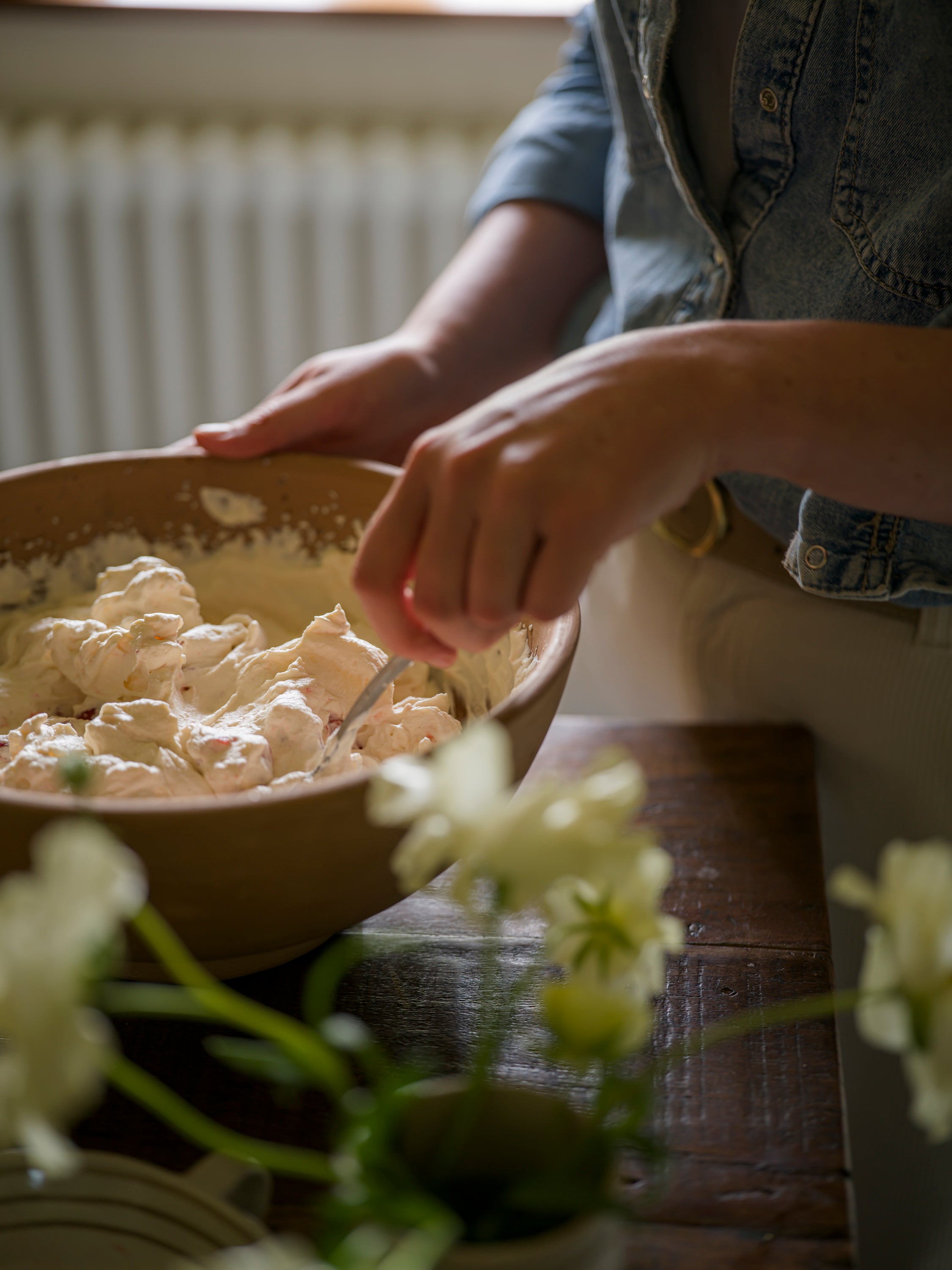 - Whip the cream until soft peaks form, then gently fold in the vanilla extract and icing sugar.