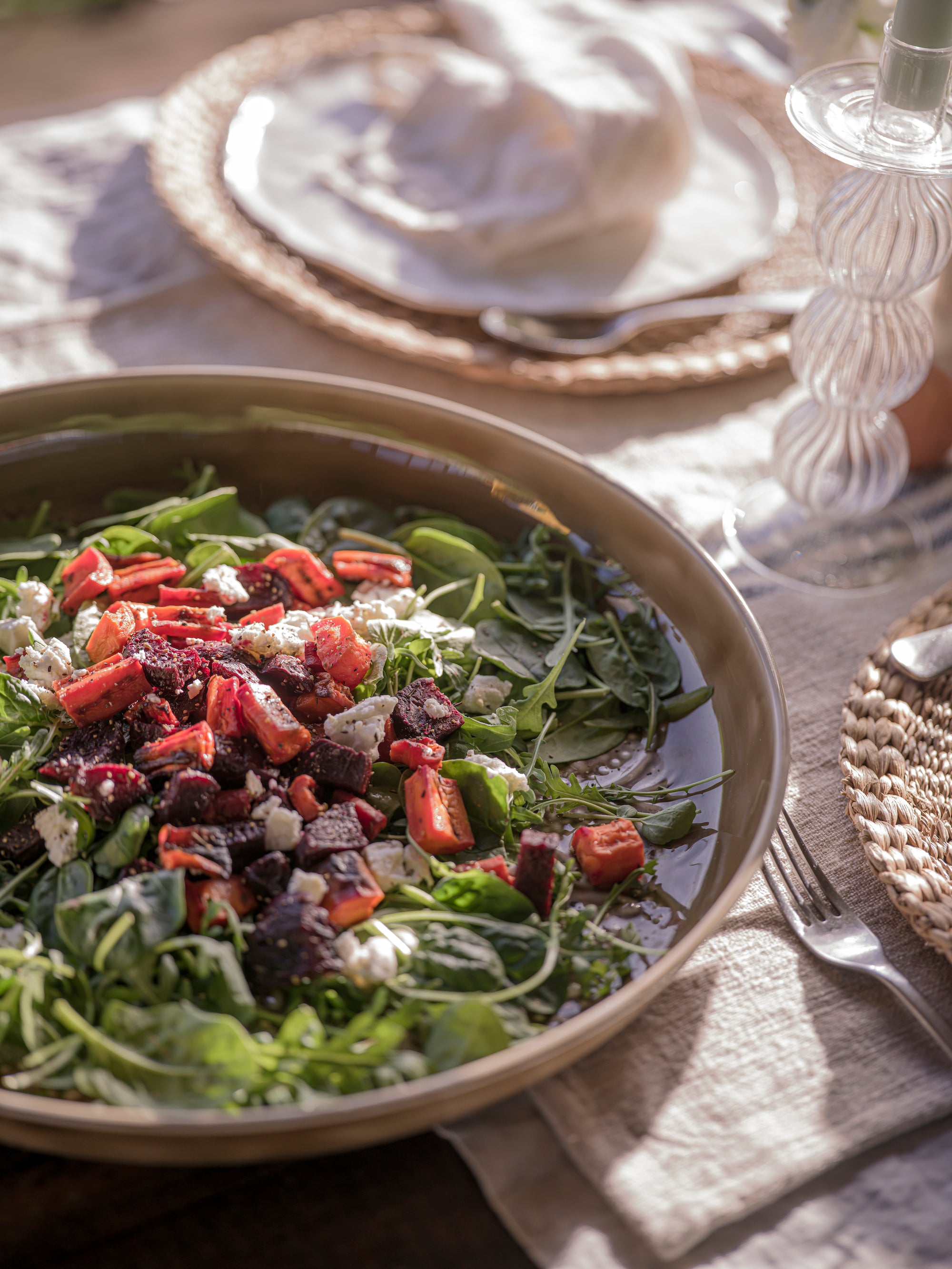 Serve by layering your greens, roasted root veggies and crumble the goats cheese on top before drizzling over your dressing. Serves 3 - 4 people.